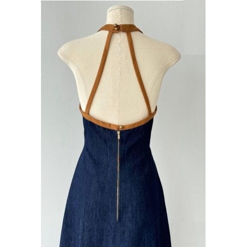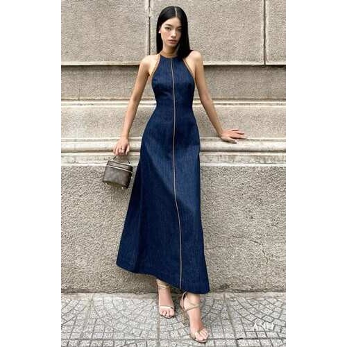 Uzun mavi kot elbise kahve askılı model sırtından fermuarlı yeni ürün